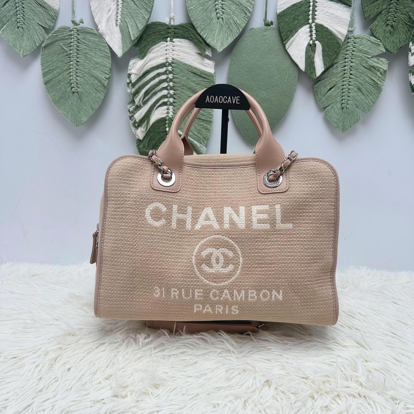 CHANEL 🤍PRE OWNED 22C Deauville Boston 奶茶米色沙灘包 晶片款 全套有盒🤎