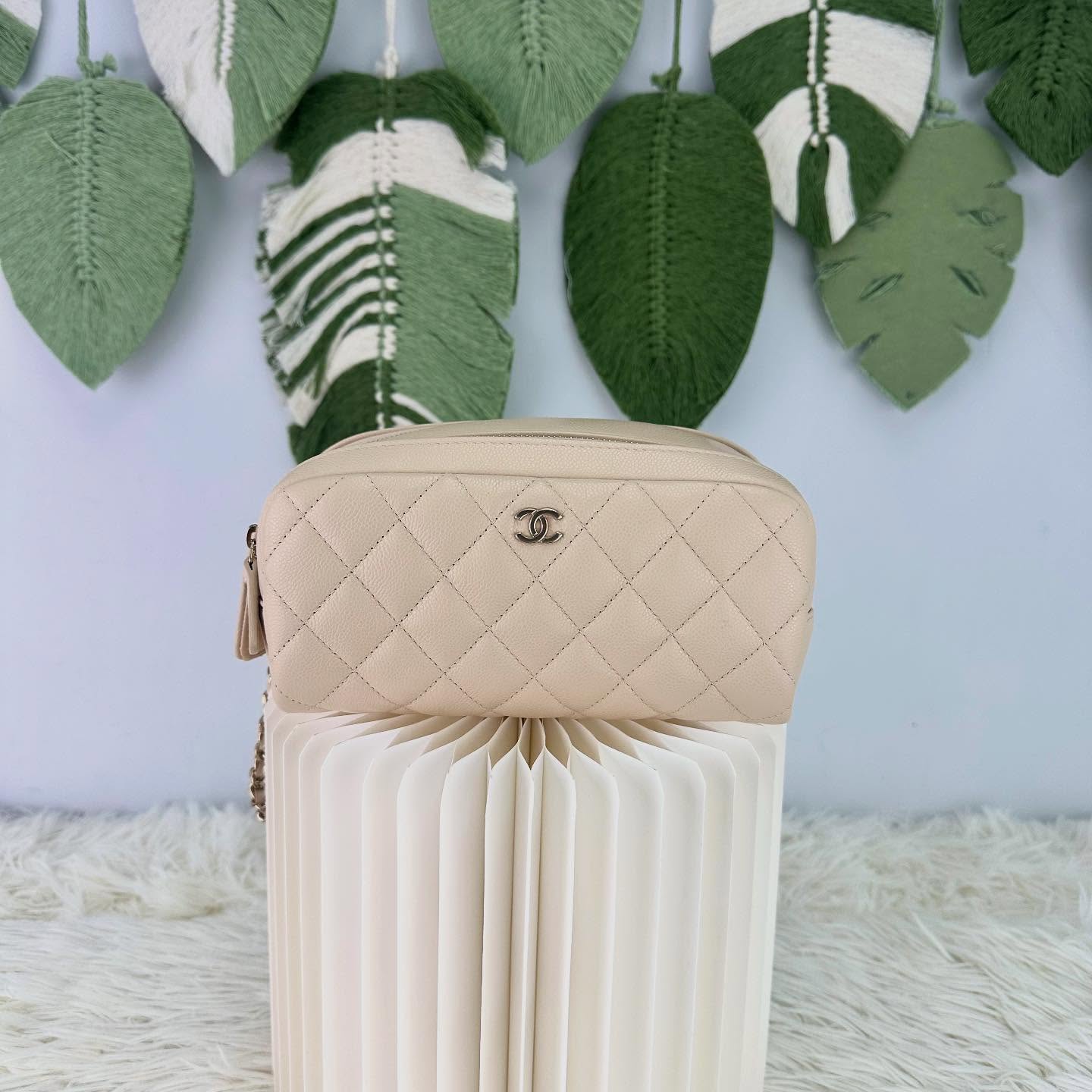 CHANEL 🤍PRE OWNED 裸粉色荔枝牛皮化妝包 手拿包 晶片款 2025年🩷