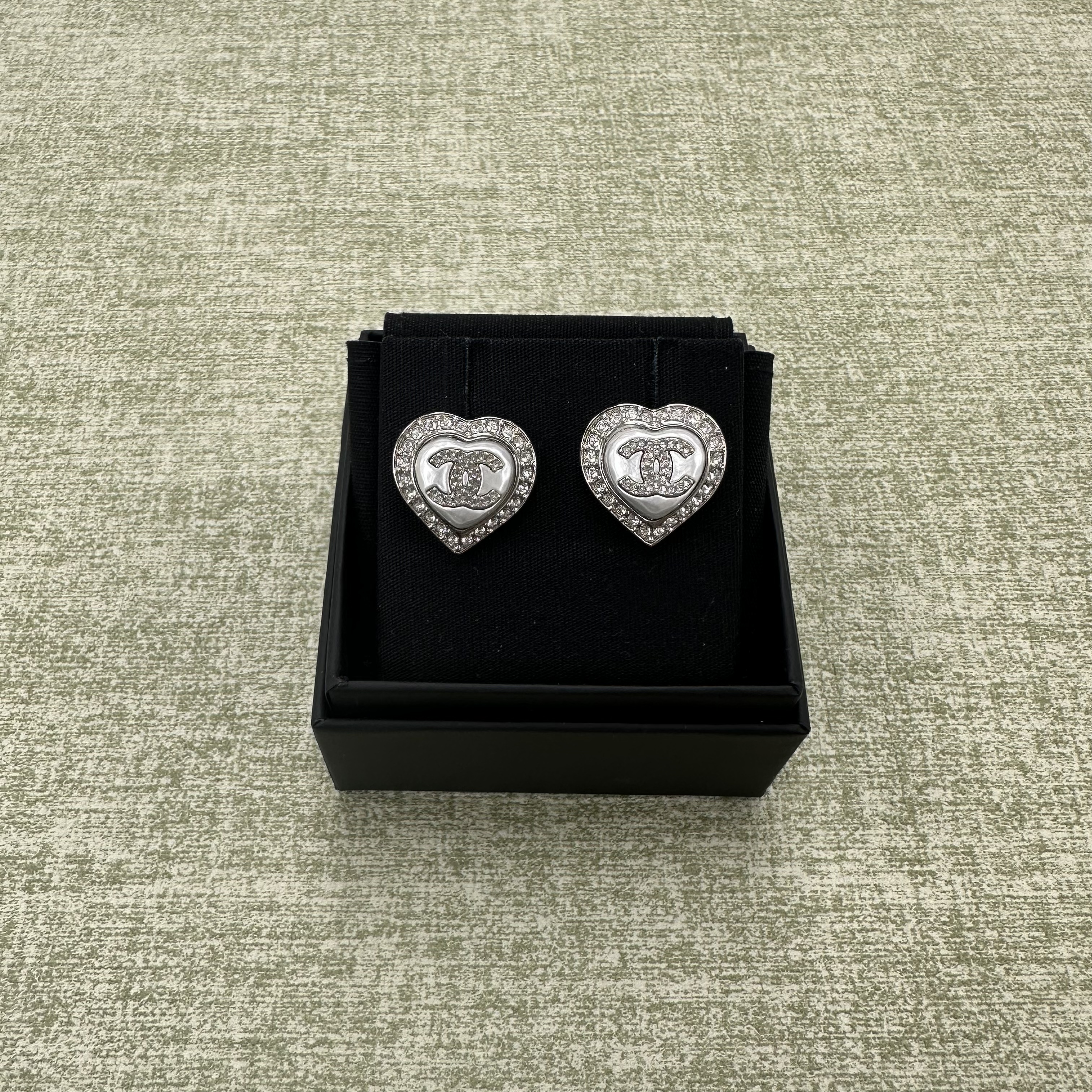 CHANEL 🤍PRE OWNED CC 銀色愛心水鑽耳環Logo耳環✨